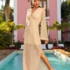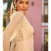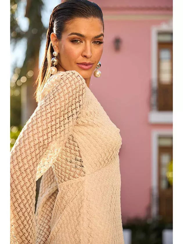 Celebrando a fusão do artesanal com o contemporâneo, este vestido longo se destaca pelo detalhe em argola no busto, criando um ponto focal único. Suas mangas trazem um ar delicado à peça e apresenta forro em comprimento mini. A abertura em zíper na lateral proporciona facilidade ao vestir. Confeccionado em crochet, a peça revela a arte e a textura em cada detalhe.