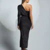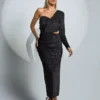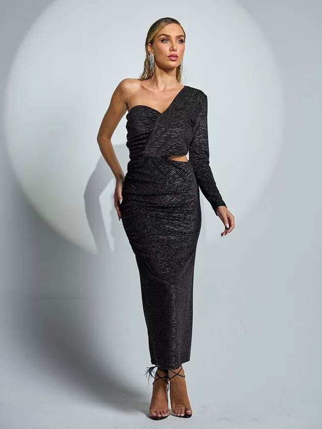 O Vestido midi com recortes assimétricos é uma peça elegante e moderna que pode ser usada em eventos noturnos e ocasiões especiais. Sua modelagem justa com franzido valoriza a silhueta feminina, enquanto os recortes assimétricos adicionam um toque de ousadia e originalidade ao visual. A manga de um ombro só confere um ar mais sofisticado e elegante à peça. Confeccionado em veludo com fio de lurex, o vestido oferece brilho e sofisticação ao uso. O vestido midi pode ser combinado com sandálias de salto alto para um visual mais elegante, ou com botas de cano alto para um visual mais moderno e despojado. Acessórios como brincos e pulseiras douradas complementam o look com elegância.