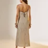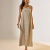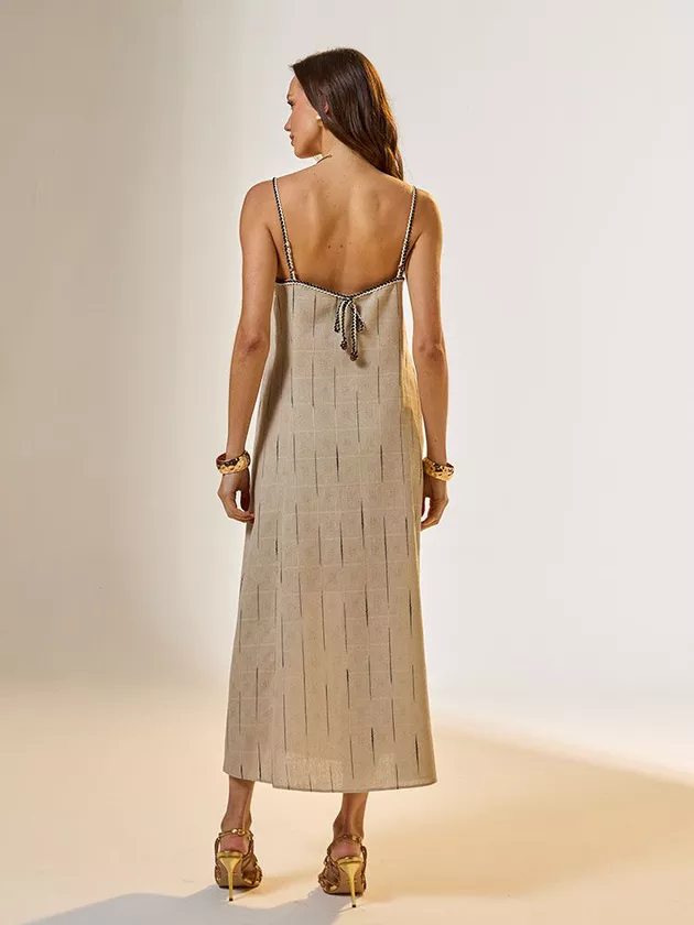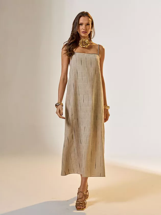 Renove seu estilo com este vestido midi de linho, que combina simplicidade com um toque de luxo. Os detalhes de um cordão bicolor adornado com fios dourados adicionam um brilho sutil, enquanto o linho puro garante um caimento leve e agradável. Perfeito para eventos diurnos ou uma saída casual sofisticada, este vestido une conforto e glamour, fazendo dele uma escolha versátil para qualquer guarda-roupa moderno e consciente das tendências.