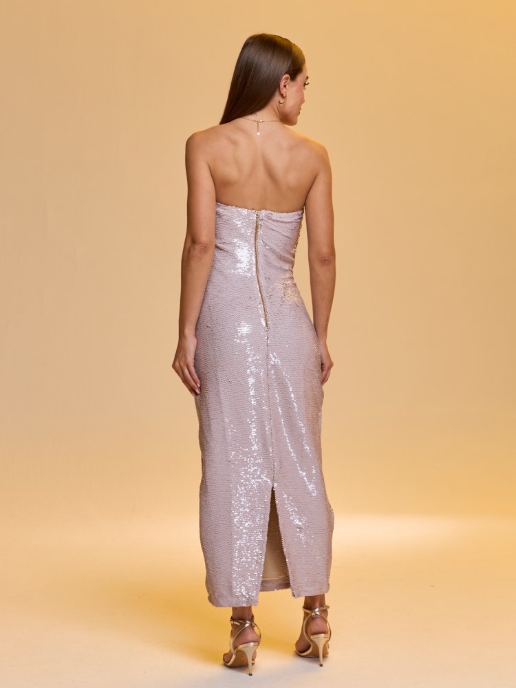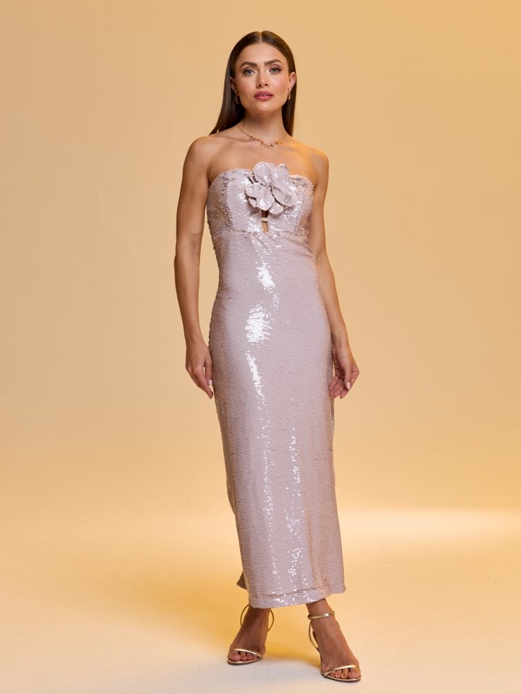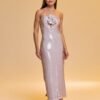 O vestido midi em paetê vinil traduz modernidade e sofisticação em cada detalhe. Com brilho intenso e textura elegante, ele conta com uma flor removível no centro do busto, trazendo versatilidade e um toque romântico à peça. O forro garante conforto, enquanto o acabamento de elástico com silicone no peito proporciona fixação impecável e segurança ao vestir. Perfeito para ocasiões noturnas e eventos especiais, pode ser combinado com sandálias de tiras finas e clutch minimalista para um look elegante e marcante.