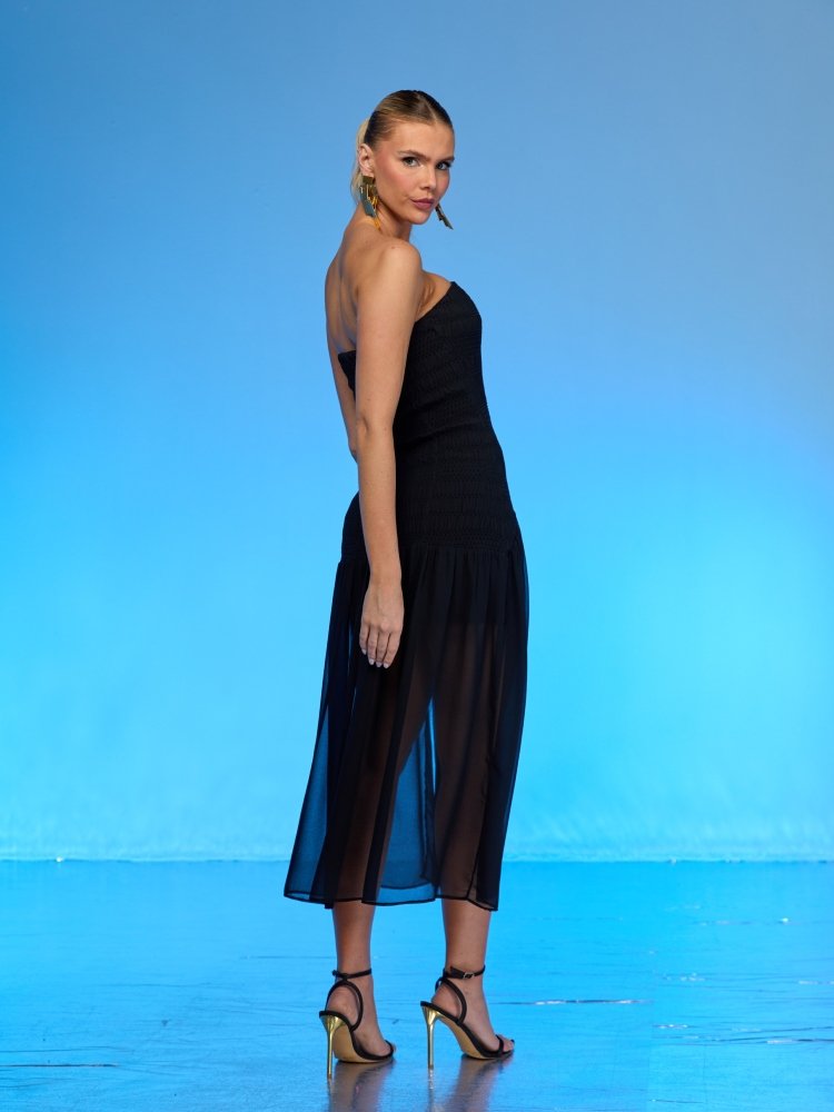 Expressivo e refinado, este vestido midi traz um jogo de volumes e texturas que enaltece a silhueta com sofisticação. A modelagem justa é equilibrada pelo detalhe solto e pelos franzidos estratégicos, enquanto os recortes e os ombros à mostra adicionam leveza e fluidez ao visual. Confeccionado em viscose com drapeado, oferece caimento elegante e toque macio. Ideal para ocasiões especiais, valoriza produções noturnas com sandálias de tiras finas e clutch minimalista — uma escolha encantadora para celebrações ou eventos marcantes.
