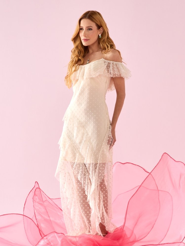 O Vestido Midi Tule Poá é a expressão do romantismo moderno. Confeccionado em tule leve e delicado, apresenta camadas de babados que criam movimento sofisticado e um visual etéreo. As alças de correntes adornadas com pérolas conferem elegância atemporal, transformando a peça em um destaque especial do guarda-roupa feminino. Ideal para ocasiões marcantes, combine-o com sandálias de salto fino e acessórios discretos para um look encantador em festas, jantares ou celebrações inesquecíveis.