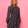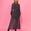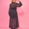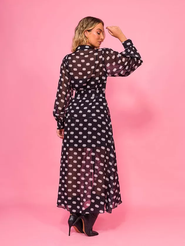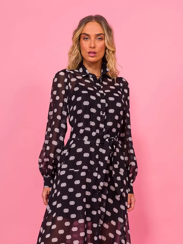 Vestido midi com recortes e abertura em botões frontais. A peça possui manga longa e vestido justo em forro ligth como forro. Confeccionado em chiffon com estampa poá com fio de lurex.