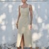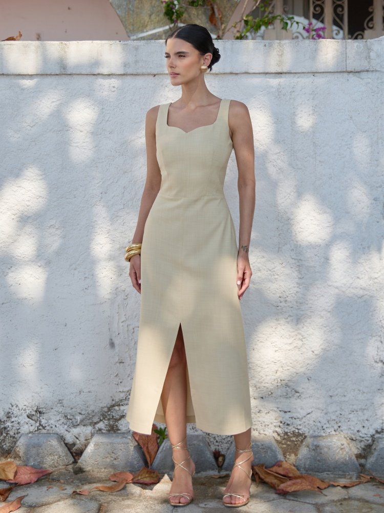 Este vestido midi em alfaiataria com textura em linho une sofisticação e modernidade em um design atemporal. Os recortes com alça larga trazem estrutura ao visual, enquanto a fenda frontal e a abertura em zíper adicionam feminilidade e praticidade na medida certa.