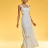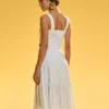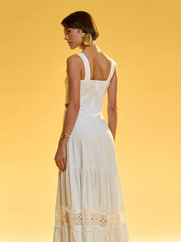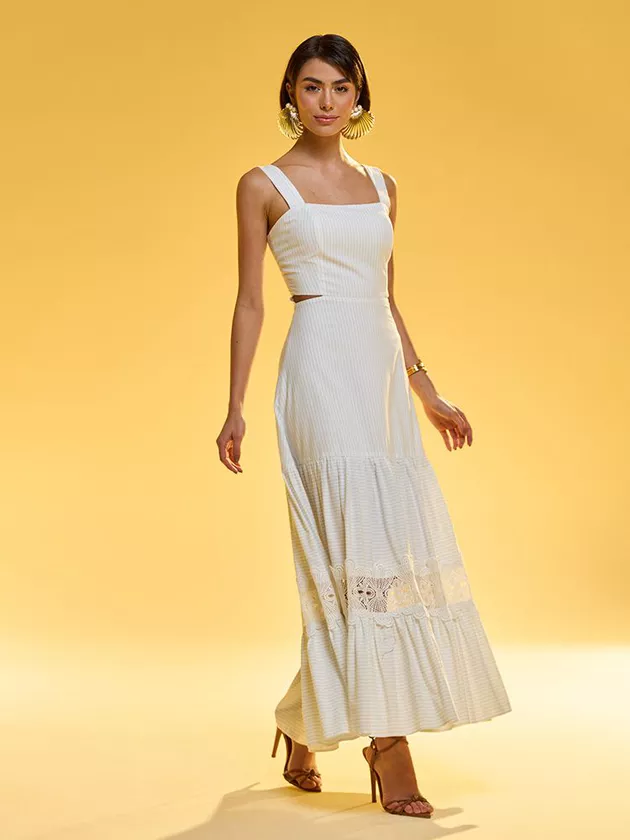 Confeccionado em algodão com risca de listras, esse vestido midi com modelagem solta é a peça perfeita para quem busca um visual moderno e delicado. Os recortes vazados nas laterais e o detalhe em guipir trazem um toque de sensualidade e sofisticação, enquanto as alças largas garantem conforto e segurança. A combinação de elementos clássicos e modernos torna essa peça ideal para eventos diurnos, podendo ser usada com sandálias ou saltos para diferentes ocasiões.