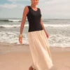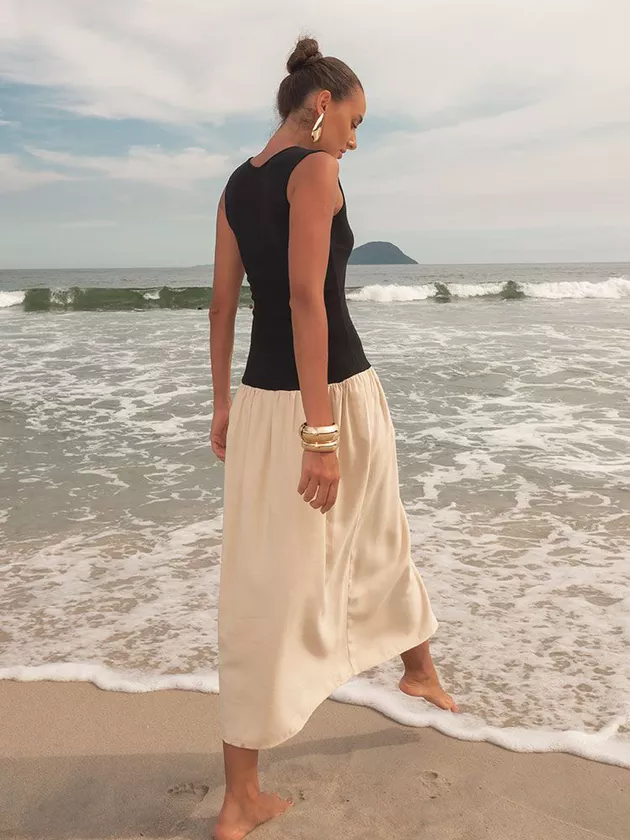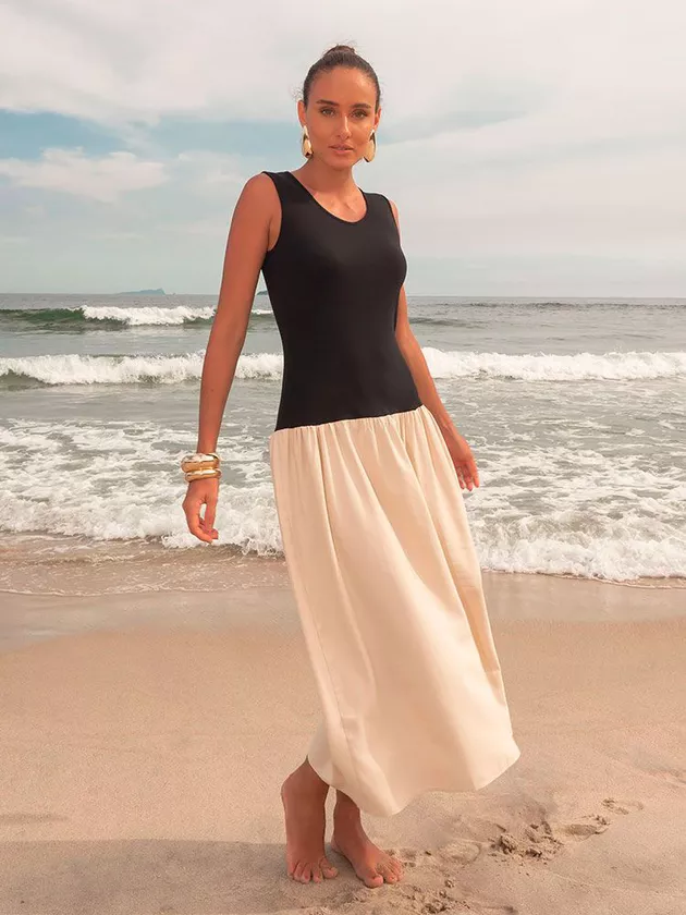 Este vestido combina o melhor dos dois mundos: a elasticidade da ribana e a sofisticação do tecido plano. Confeccionado com ribana no topo e tecido plano na saia, ele proporciona conforto e mobilidade, mantendo o visual elegante e estruturado. A modelagem fashion do vestido é uma ótima pedida para quem quer investir em um visual moderno e cheio de atitude, refletindo as tendências atuais de roupas versáteis e de fácil adaptação. Perfeito para o dia a dia, pode ser usado em eventos informais ou até em um look casual-chique com acessórios certos. Seu corte ajustado e a estrutura da saia garantem um visual feminino e elegante, sem perder a praticidade.